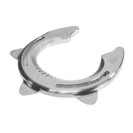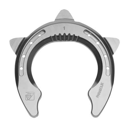 Shoe with parabolic surface area: wide surface at toe, narrow on branches, wide at heels. Made from hi-tech aluminium alloy. Non-tempered alloy : can be used for risk-free hot shoeing up to 450°C. 3 clips to allow use with option of 1 toe clip or 2 lateral clips. Thickness 10 mm.