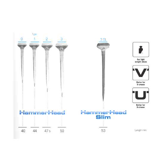 Tête large rectangulaire, prolonge la durée de vie des fers aluminium. Le collet bien distinct et la tête gaufré permettent de bloquer le clou dans la rainure. Lame longue et fine.