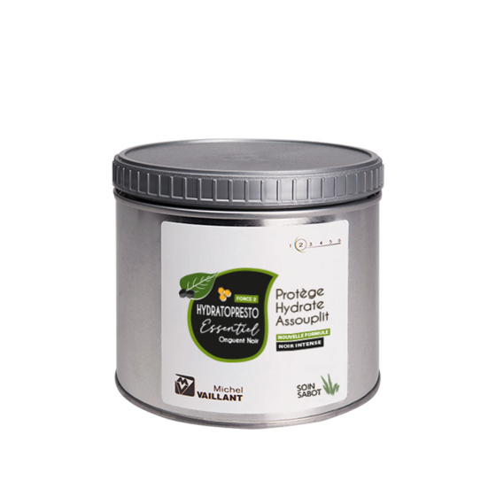 The HydratoPresto Intense Black Ointment – Essential Strength 2 offers a triple action for horse hooves. Its rich, smooth texture applies easily and enhances the appearance of the hoof.