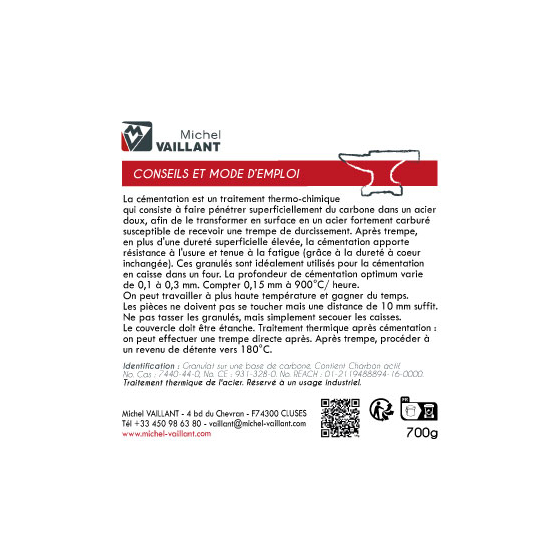 Ces granulés sont idéalement utilisés pour la cémentation en caisse dans un four. La profondeur de cémentation optimum varie de 0,1 à 0,3 mm. Compter 0,15 mm à 900°C/ heure. On peut travailler à plus haute température et gagner du temps.