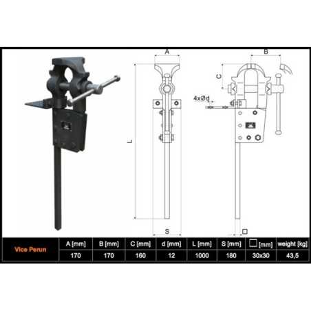 Heavy loads, maximum impact resistance. Jaws made of high strength alloy steel. Hardened steel trapezoidal thread screw. Large plate for fixing to the workbench. Jaw width: 170 mm. Height 950 mm. Weight 44 kg.