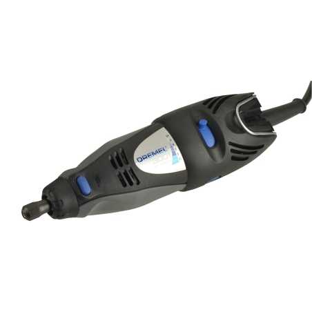 220 Volts. 130 W. Vitesse variable 10000 à 33000 tr/mn. Vendu en coffret (25 accessoires) avec meulettes, mèches, pinces de serrage diamètre 3,2 mm maxi.