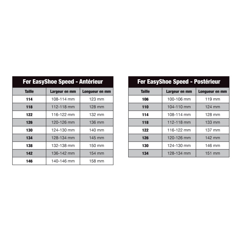 Ce modèle est disponible en versions antérieure et postérieure afin d’assurer un ajustement optimal sans modification. Fer disponible en antérieur dans les tailles allant de 114 à 146 et en postérieur de la taille 106 à 134. Le modèle postérieur peut également être utilisé sur des sabots antérieurs plus étroits.