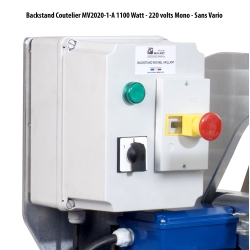 Moteur à condensateur monophasé 220 volts, 3000 tr/mn, puissance 1100 Watt. Bouton marche arrêt, sécurité magnéto thermique + inverseur de sens de rotation + arrêt coup de poing. Poulie moteur et clavetage adaptés Réf. BACKSTANDCOUTELIERMV2020-1-A