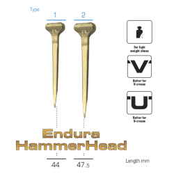 Le Hammer Head est un clou destiné aux fers de course.Un collet distinct et une tête gauffrée associée à la technologie du “pitch” permettent d’obtenir un véritable blocage du clou dans la rainure. Une lame longue et fine pour brocher haut si necessaire permet un rivetage facile et solide. La finesse et la précision de la pointe assurent un brochage rationnel limitant ainsi l’impact sur la paroi au strict minimum. Endura est un revêtement qui fournit jusqu'à 30% de résistance supplémentaire, vous pouvez donc utiliser un clou plus fin, ce qui améliore l'enfoncement du clou et réduit les dommages de la paroi du sabot. Revêtement non toxique qui laisse les sabots propres sans traces d'oxydation.