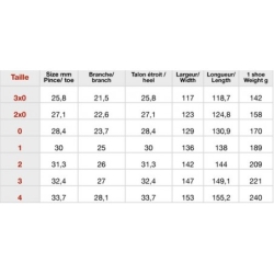 Large couverture en pince pour protéger l’avant du pied et équilibrer l’enfoncement entre la pince et les talons sur sol pénétrable et dense. Branches étroites pour faciliter l’enfoncement latéral ou médial du pied en virage sur sol pénétrable et dense.