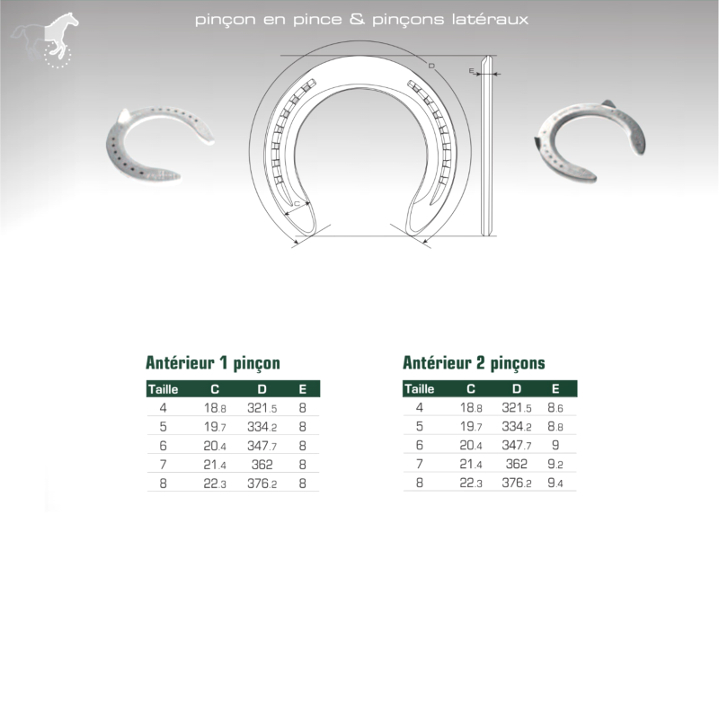 Fer alu spécialement conçu pour les chevaux de course. Permet de trouver l'équilibre haute performance/surcharge. Evite les blessures. Départ du pied sans contrainte dans toutes les directions grâce au relevé de pince multidirectionnel. Résiste à l'usure, évite la pose d'inserts. Rainure en V pour faciliter l'adaptation des clou. Poids réduit grâce à sa forme concave. 2 pinçons. Tailles 5, 6, 7 et 8.