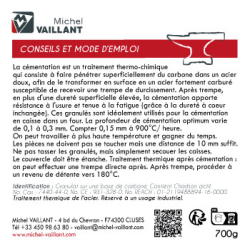 Ces granulés sont idéalement utilisés pour la cémentation en caisse dans un four. La profondeur de cémentation optimum varie de 0,1 à 0,3 mm. Compter 0,15 mm à 900°C/ heure. On peut travailler à plus haute température et gagner du temps.