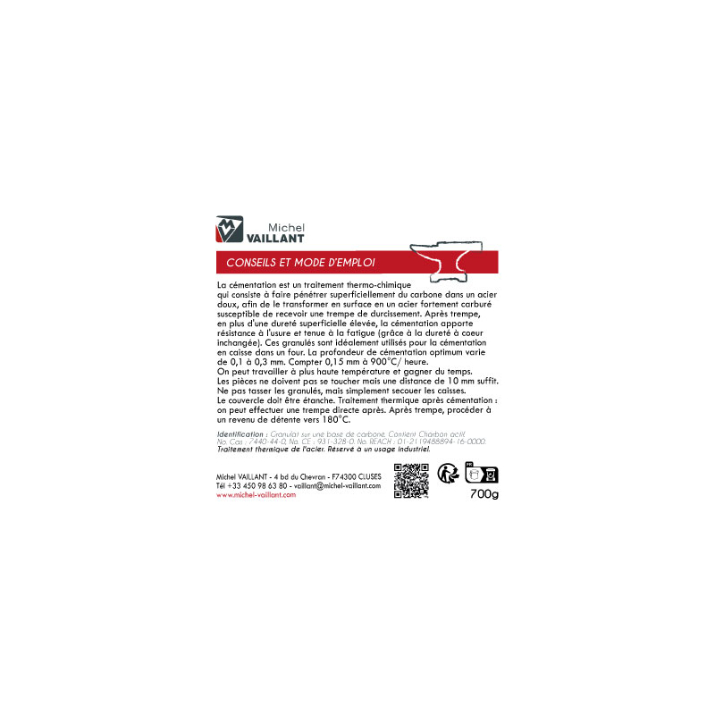0/5Traitement thermique de l'acier afin de le transformer en surface en un acier fortement carburé susceptible de recevoir une trempe de durcissement. Fiche technique du produit en Pièce jointe (voir ci-dessous).