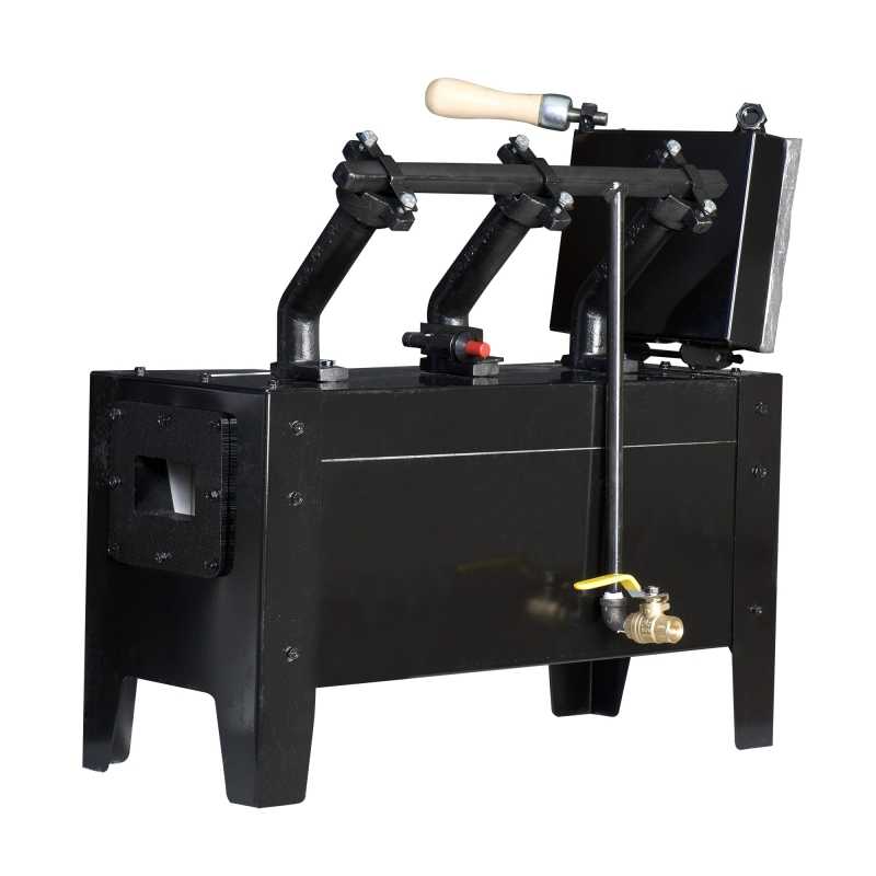 Le design du foyer est pensé pour offrir une montée en température rapide grâce à l'utilisation de trois brûleurs en fonte d'acier, associés à une section de foyer réduite qui optimise la chaleur. Cette conception assure une température homogène dans tout le four, idéale pour le traitement thermique des lames.