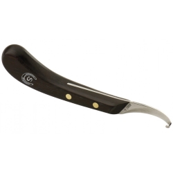 Manche galbé. Lame en acier haute qualité. Profil de coupe droit et montage de lame incliné : permet un angle d'attaque et une position de main qui évitent de descendre trop profondément dans le pied. Idéal pour les chevaux avec peu d'épaisseur de sole.