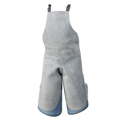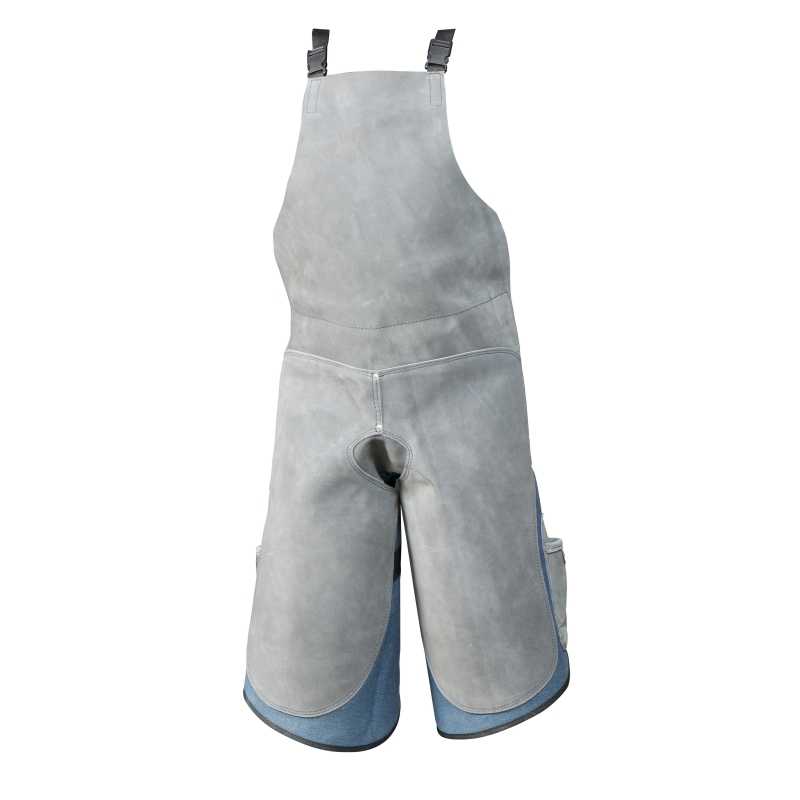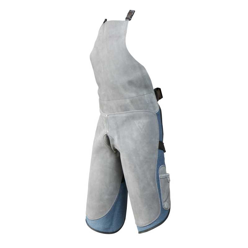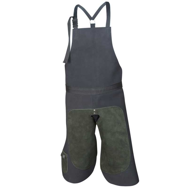 En croute de cuir souple double épaisseur. Protège du buste aux genoux. Jambières courtes, 1 poche renette, 1 protection ventrale et buste, bretelles dorsales. Système d'attache qui laisse les épaules et les jambes entièrement libres.