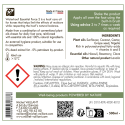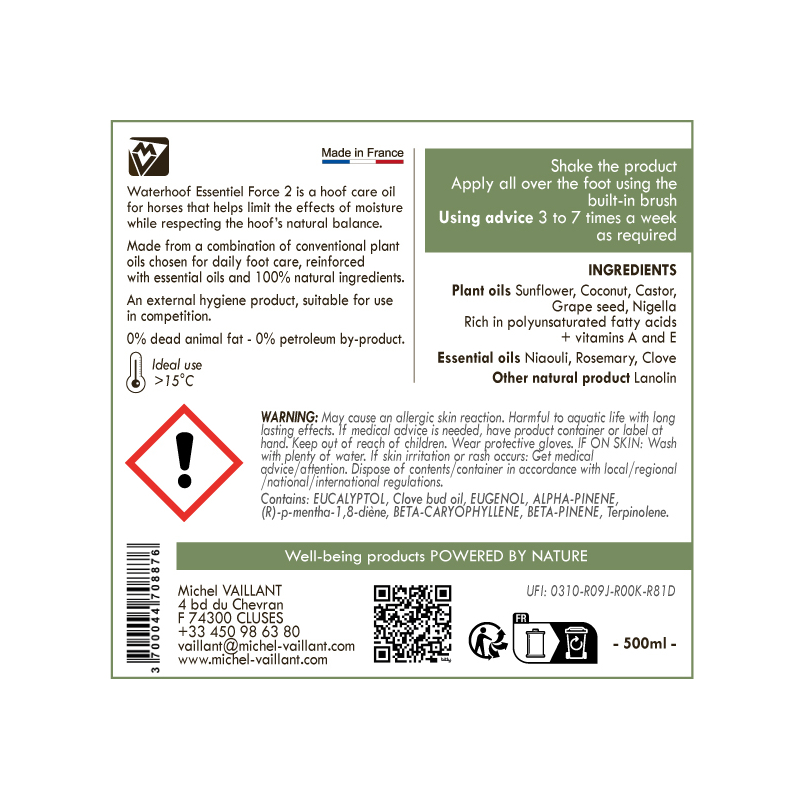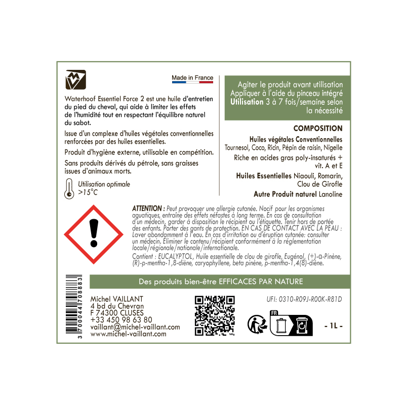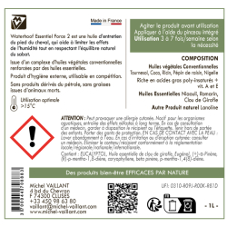 L'huile Waterhoof Essentiel Force 2 est issue d'un complexe d'huiles végétales conventionnelles soigneusement sélectionnées et enrichies par des huiles essentielles.